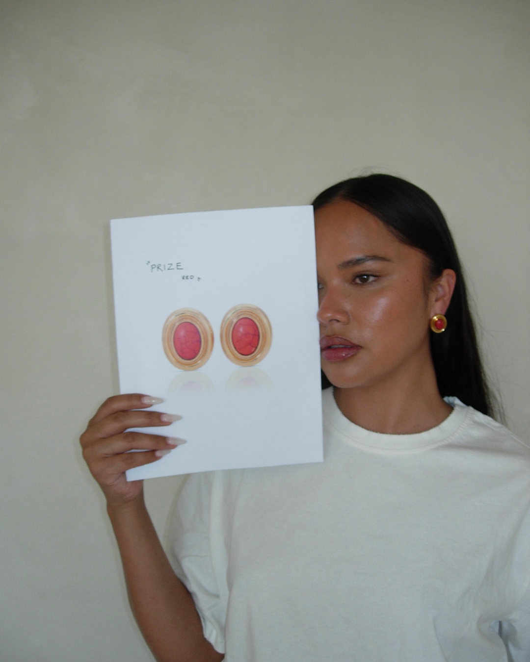 Our Prize earrings are brass with 18k gold with a red enamel stone. They’re light-weight earrings that you can easily take from day to night and they add the perfect hint of color to your wardrobe.